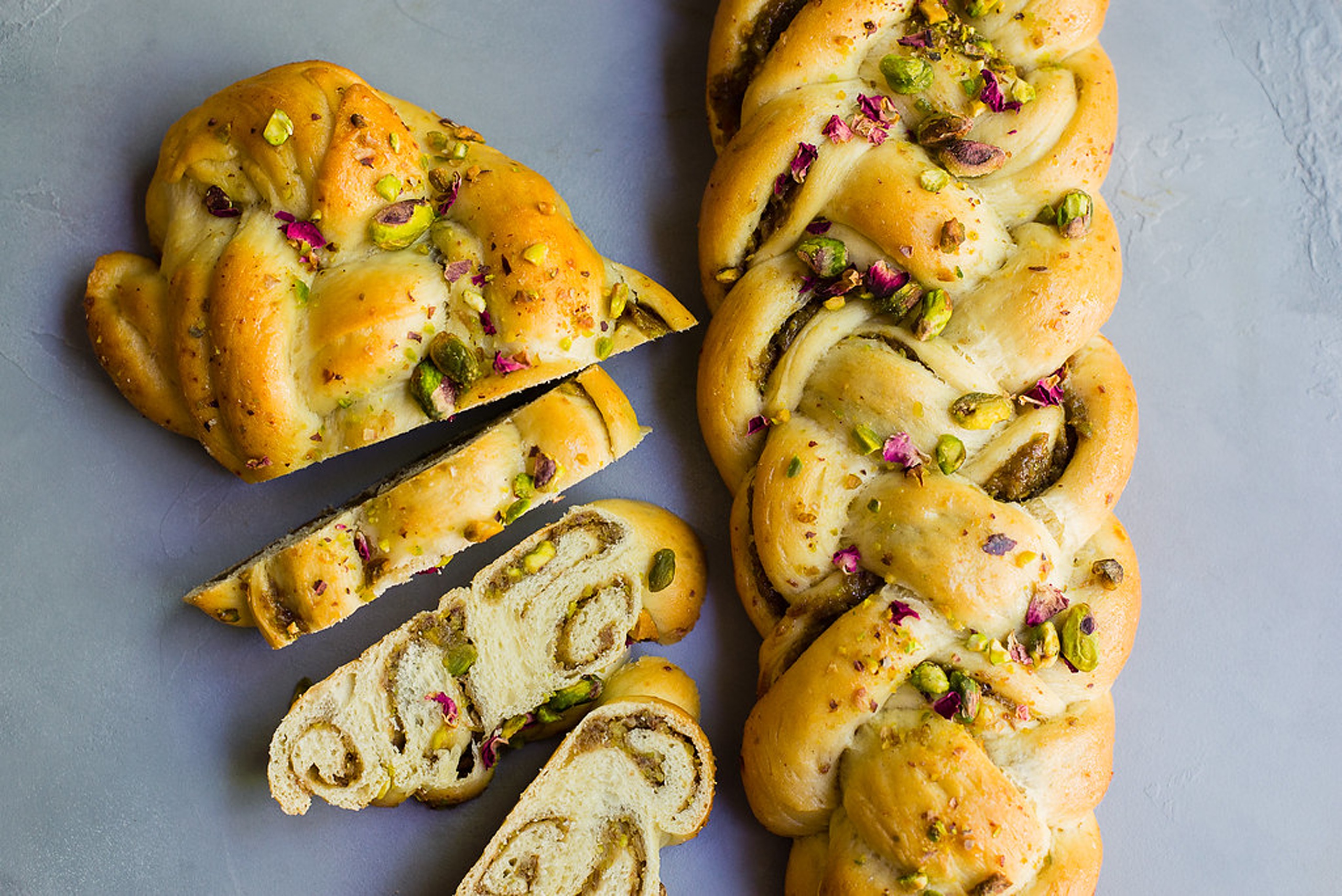 Shavuot is also known as the Festival of Roses, and some Sephardi communities have a tradition of eating dishes made with rosewater – like this mouthwatering challah swirled with Mediterranean flavors of cardamom, dates, pistachios, and rosewater.