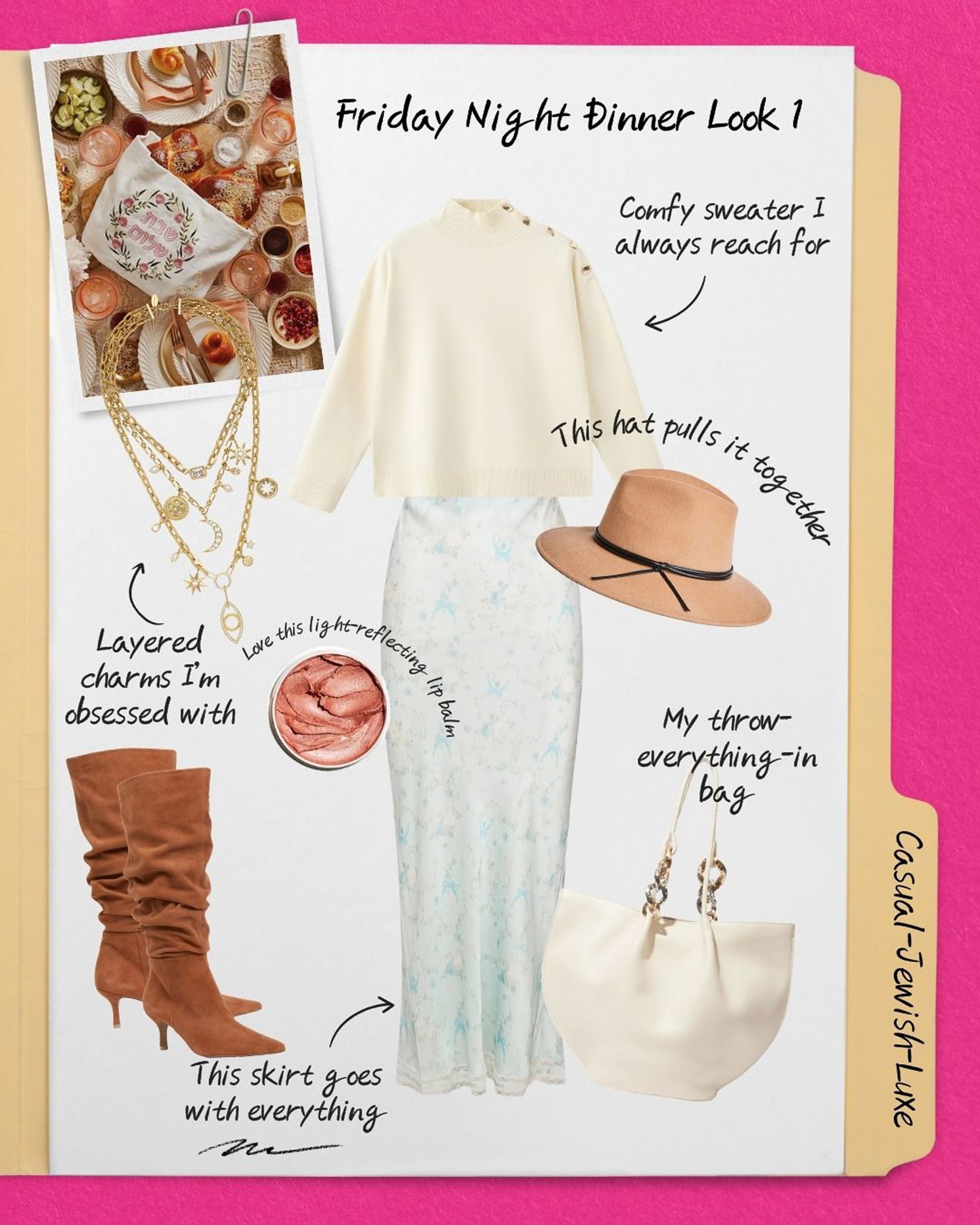 This is your go-to “effortless but pulled together” Friday night look. A soft, cozy sweater paired with a fluid skirt is one of those combinations that always works. Layered gold charms add warmth and personality, a wide-brim hat instantly pulls everything together, and a roomy neutral tote handles all the Friday night essentials. Finished with a subtle glow and boots that go with everything, this is relaxed Shabbat style at its best.