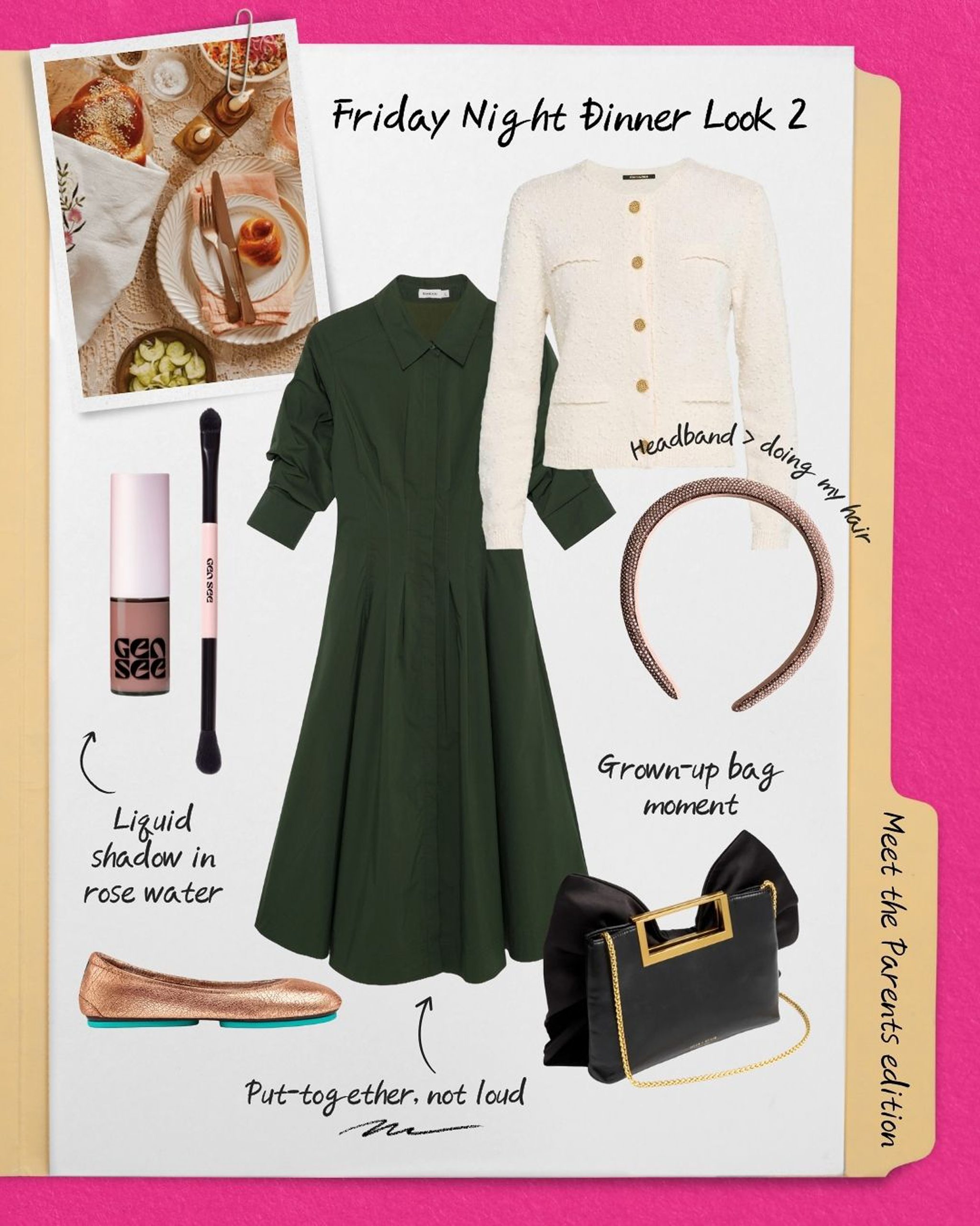 When you’re hosting, comfort is non-negotiable – but that doesn’t mean you need to scrimp on style. Here, a beautifully cut knit dress strikes the perfect balance: flattering, easy to move in, and still special enough for Shabbat. Layered Jewish jewelry adds meaning, embellished flats keep things practical, and a luminous base boosts that candlelit glow to the next level.