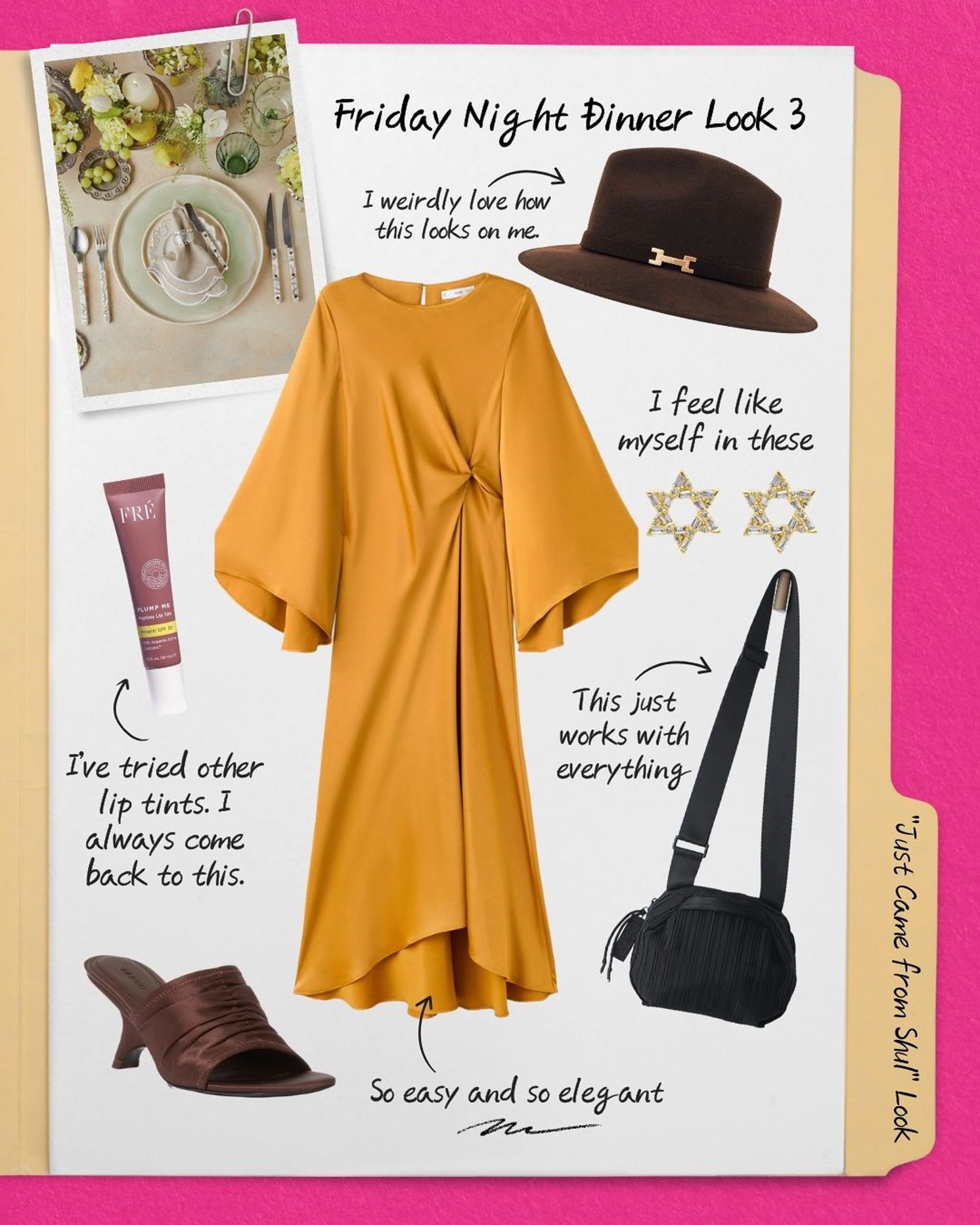 This outfit will take you from Kabbalat Shabbat to cocktails and back again. A flowing dress keeps you covered up without being even a little bit boring, statement earrings with Jewish symbolism feel meaningful without being overdone, a crossbody bag keeps things practical, and a statement hat ties it all together.