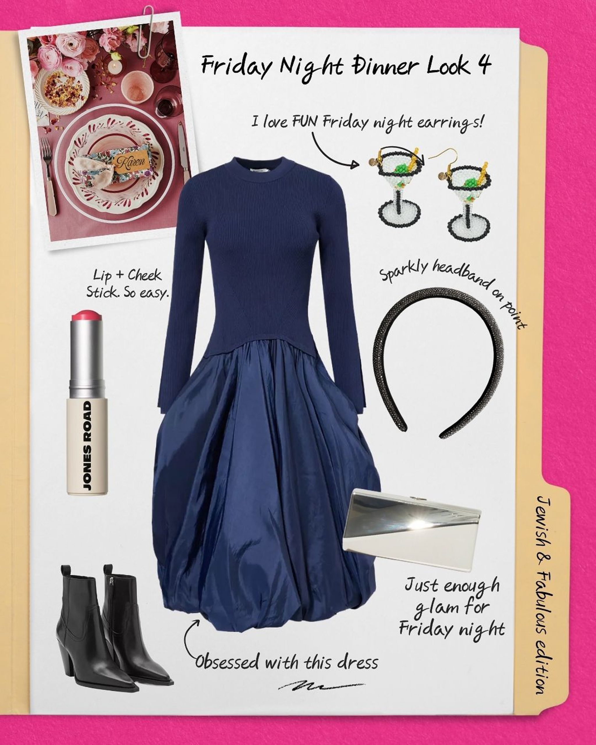 From easy dresses and cozy knits to meaningful jewelry and handbags to hold your Jewish life, these outfits prove that supporting our community can look as good as it feels. Each look is designed for real Friday nights – whether that means hosting friends, heading out for dinner, going to shul, or a chill evening of candle lighting and challah at home.