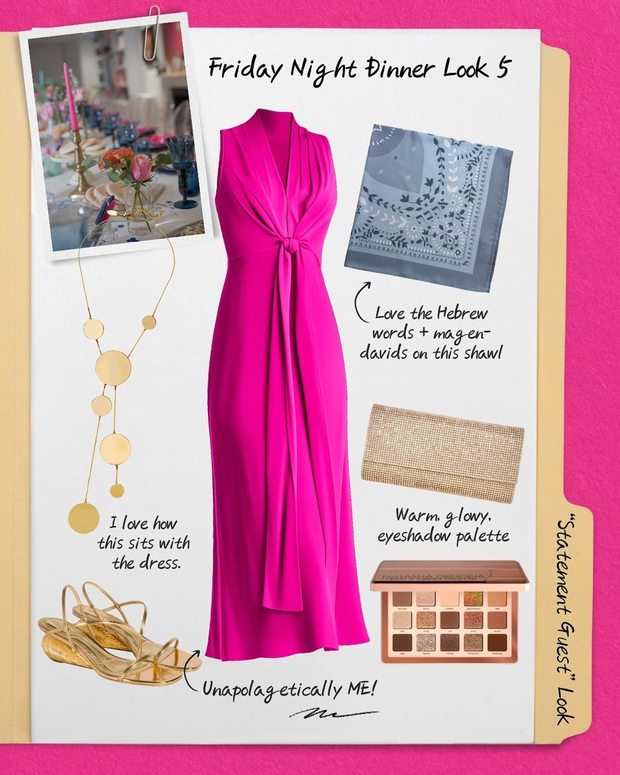 If you’re heading out and want to make an entrance, this one’s for you. A vibrant, flowing dress (in my signature colour, no less!) does the heavy lifting. Paired with warm gold jewelry, delicate heels, a beautiful shawl with subtle Jewish motifs, and a soft, glowy makeup palette, this look feels confident, celebratory, and unapologetically joyful.