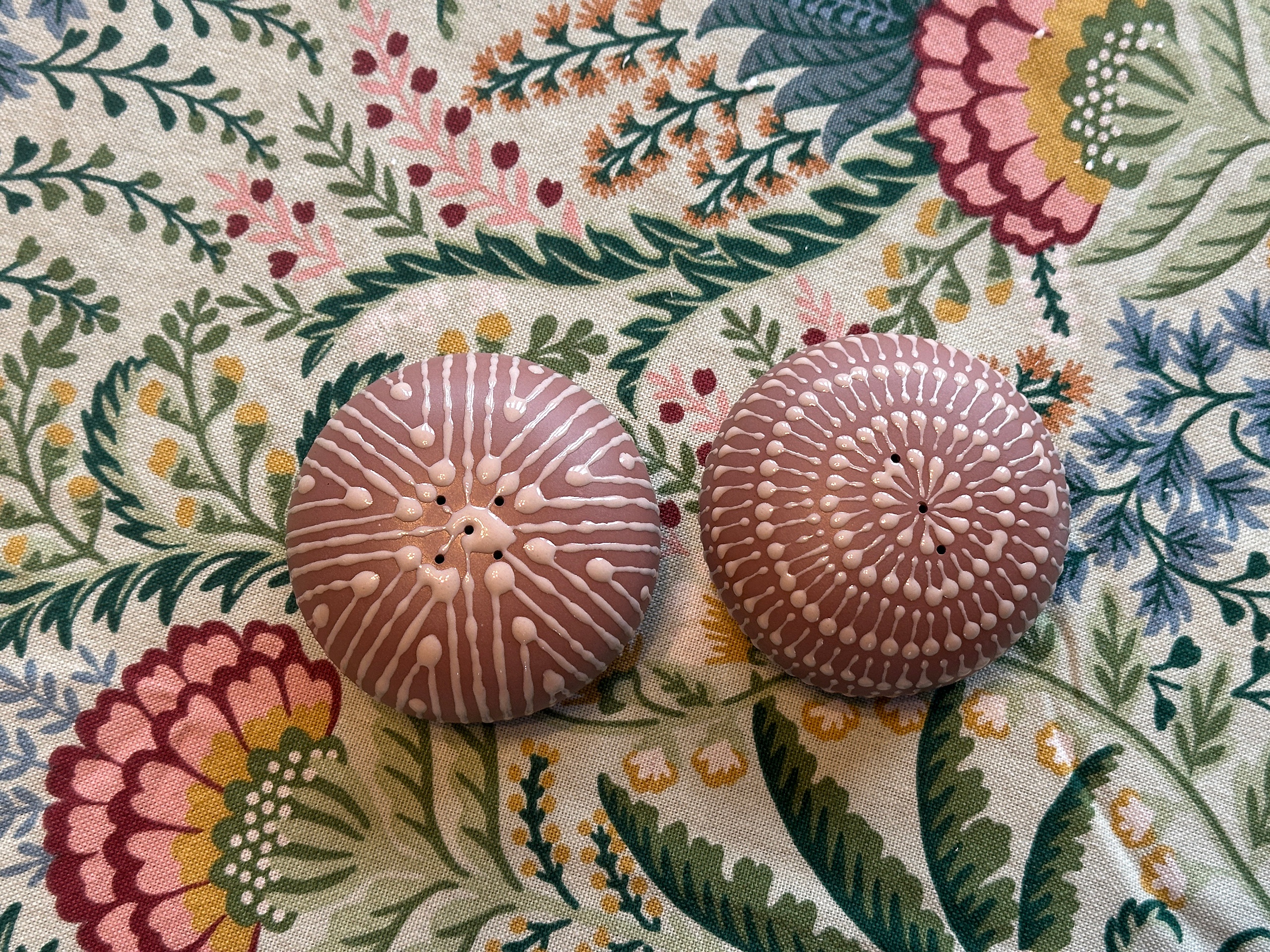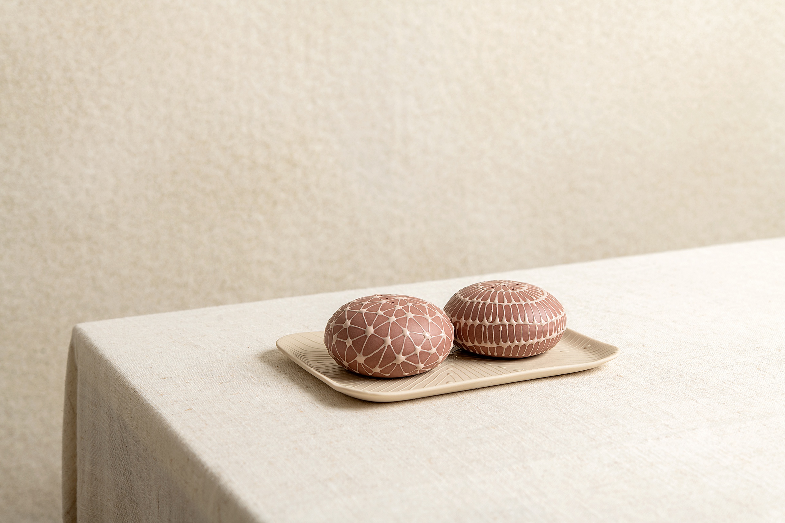 And finally, the salt and pepper shakers in Indian red with cream spiral and stars. Again, I love the way these play with shape, bringing a touch of the unexpected to the table in a way that’s totally chic.
