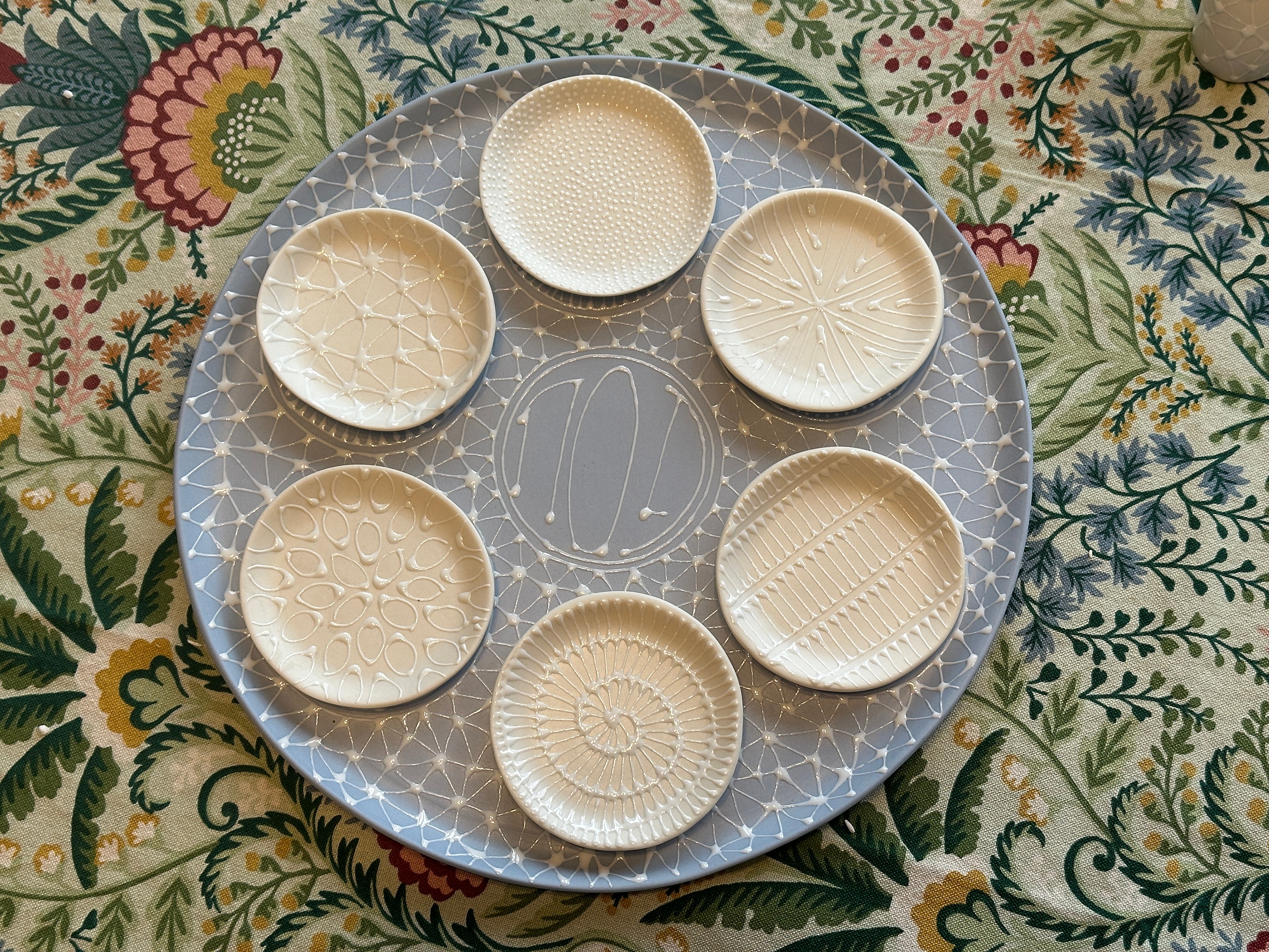 First off, there’s the seder plate, which is an absolute showstopper. Featuring a sky blue background with Maiyan Ben Yona’s trademark white star pattern (it just happens to be a perfect match for my front door mezuzah case!), the slots for each of the six items all have their own individual pattern – as do the bowls that fit into those slots.