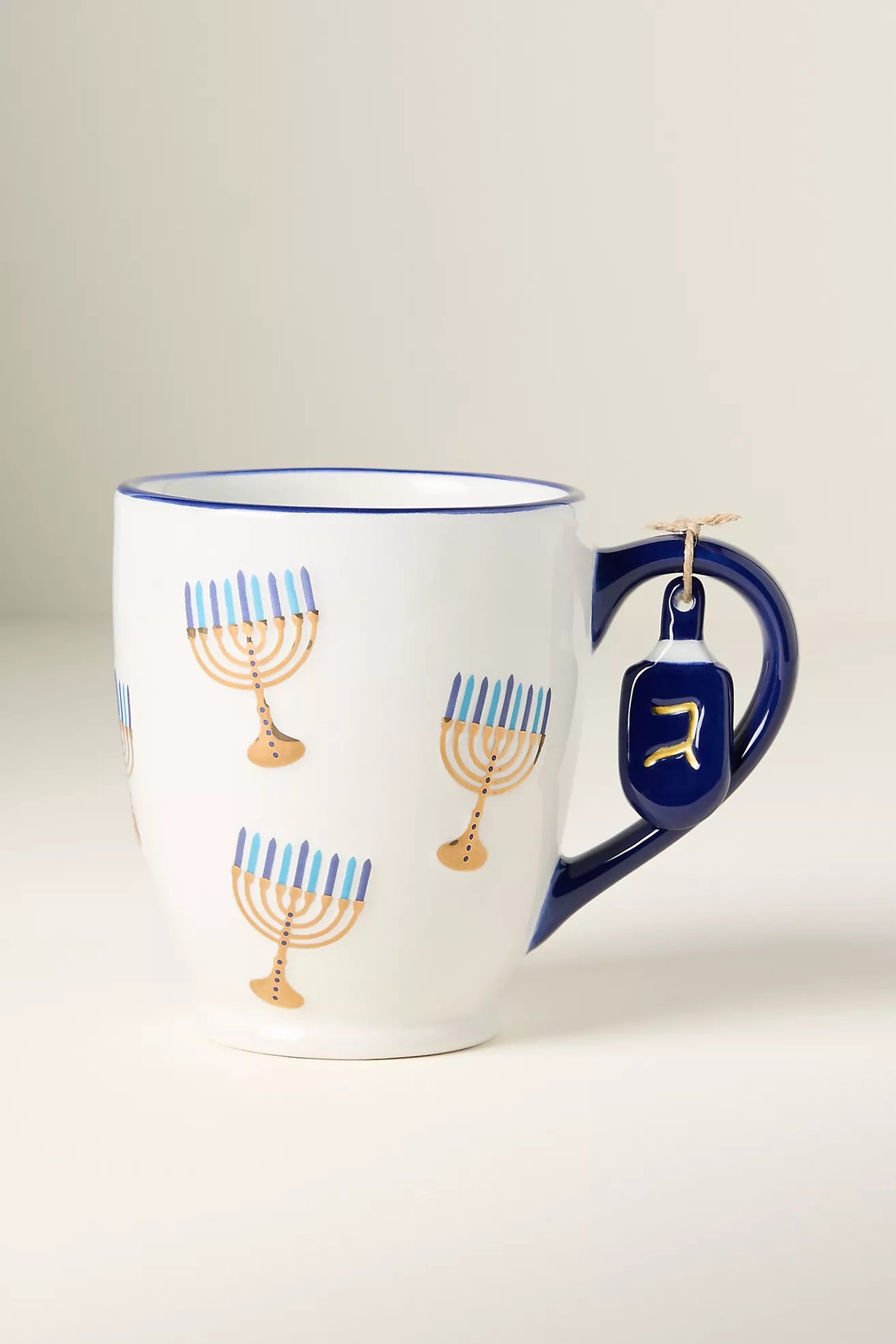 This festive mug is the perfect vessel for gelt hot chocolate – and what a perfect touch that dreidel charm hanging off the handle is!
