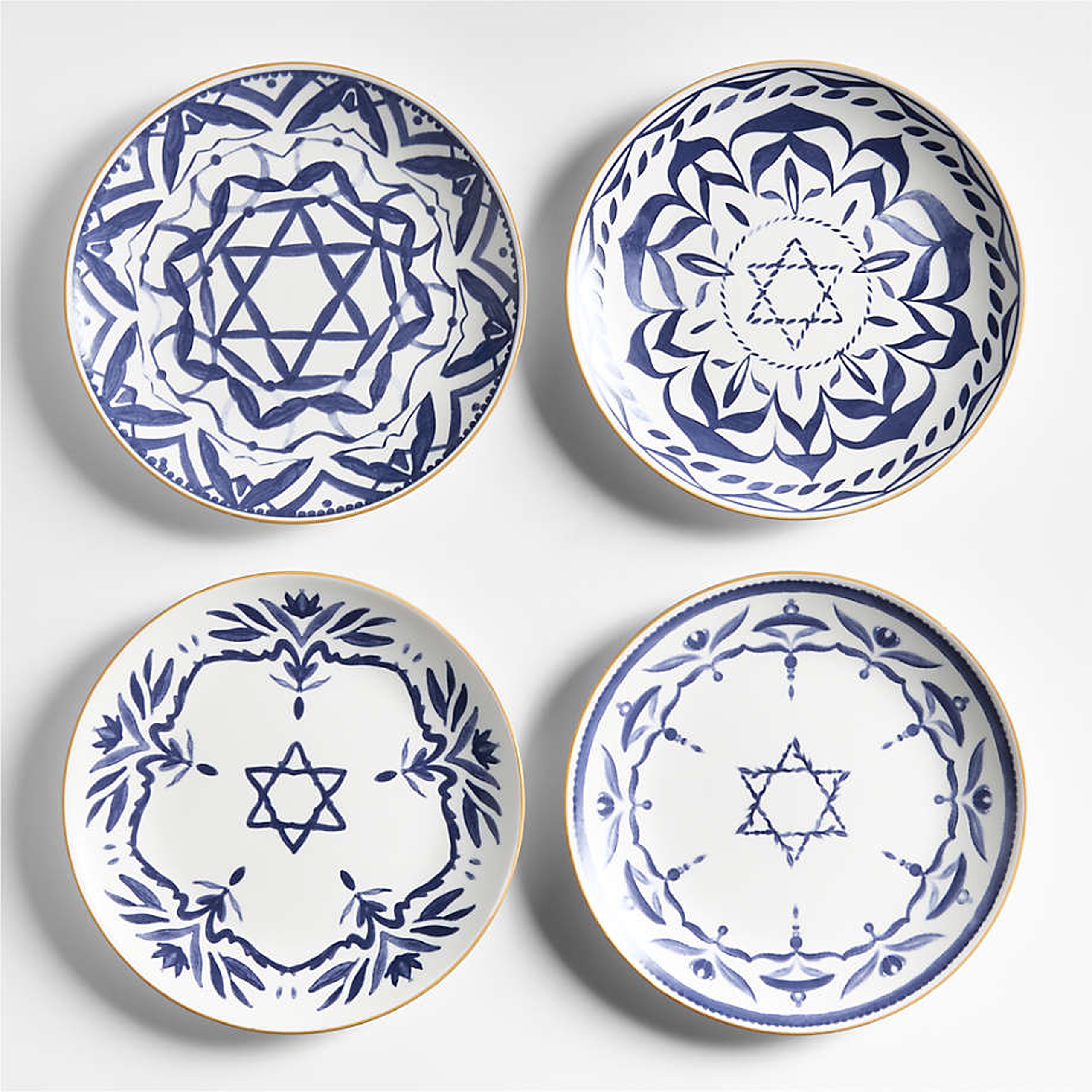 We’re starting off strong with this set of four salad plates from Crate and Barrel, each adorned with a blue-and-white watercolor Magen David motif. While they’re perfect for Hanukkah, they’d also be great to bring out for Shabbat and other Jewish holidays throughout the year.