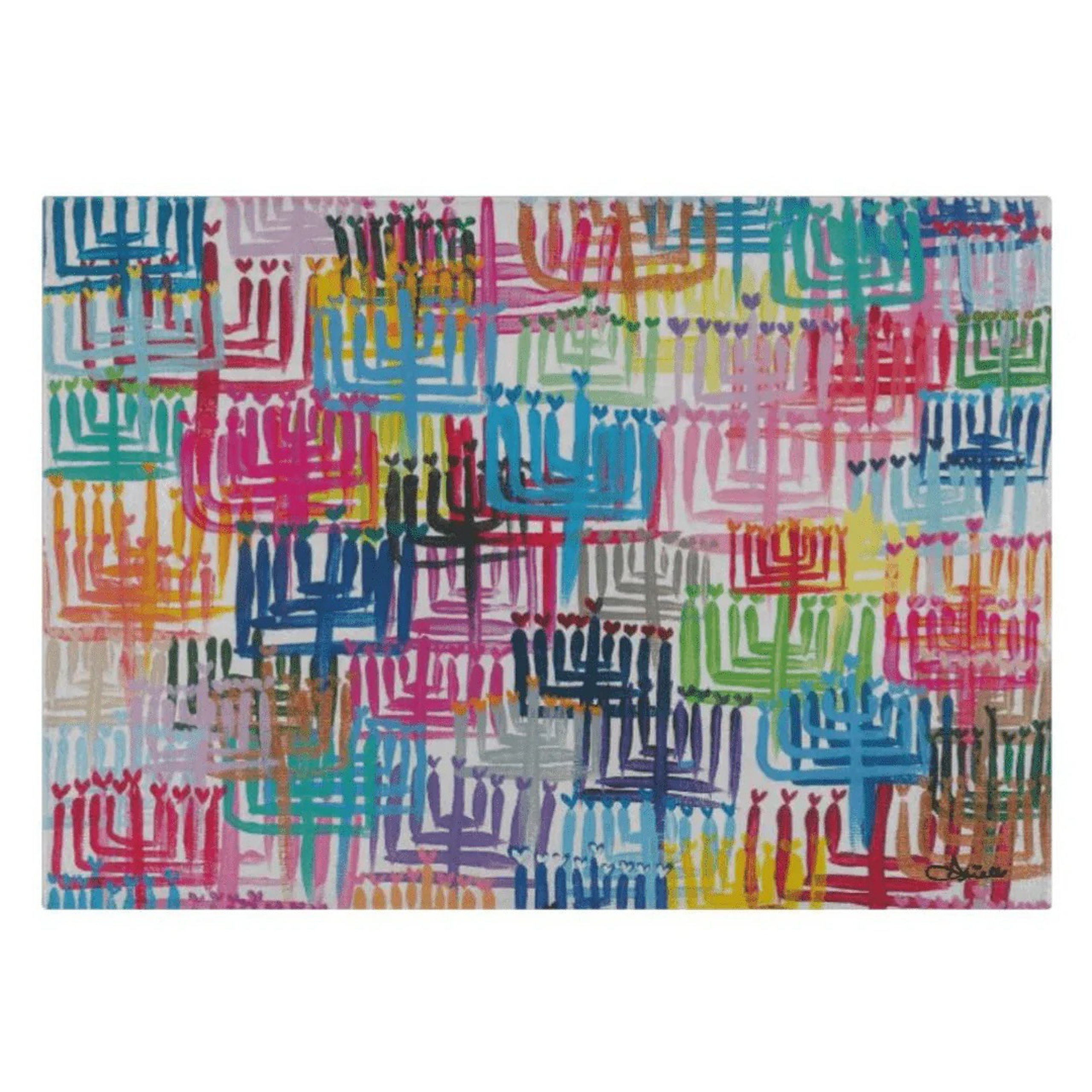 If you think it’s far past time Hanukkah broke out of the blue-and-white mold, Judaica artist Arielle Zorger agrees with you – and I love the colorful, whimsical feel of her Glass Hearts Menorah Drip Board, which also doubles as a cutting board, challah tray, or latke tray.