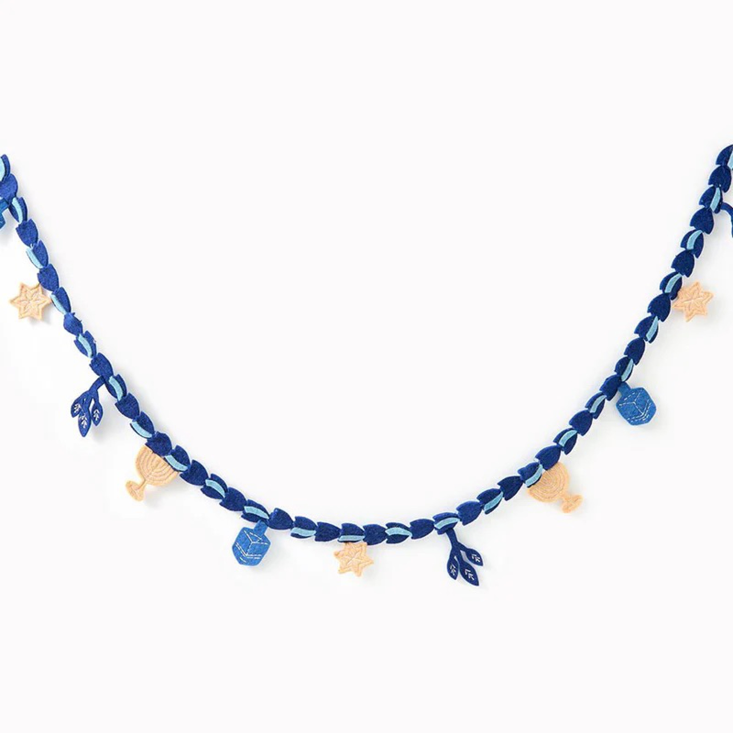 I love this sweet felt Hanukkah garland, featuring menorahs, dreidels, Magen Davids, and wintry leaves.